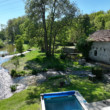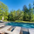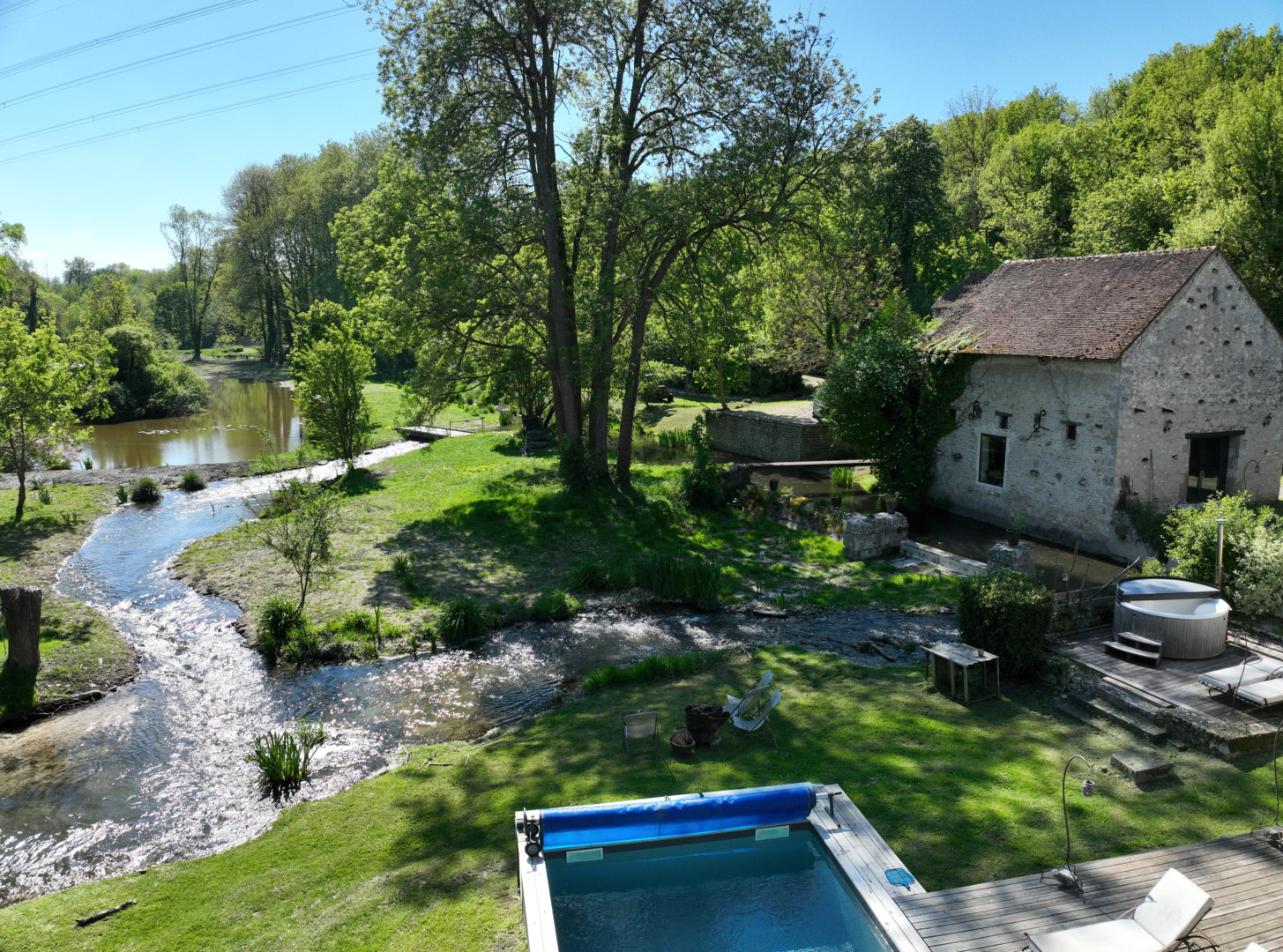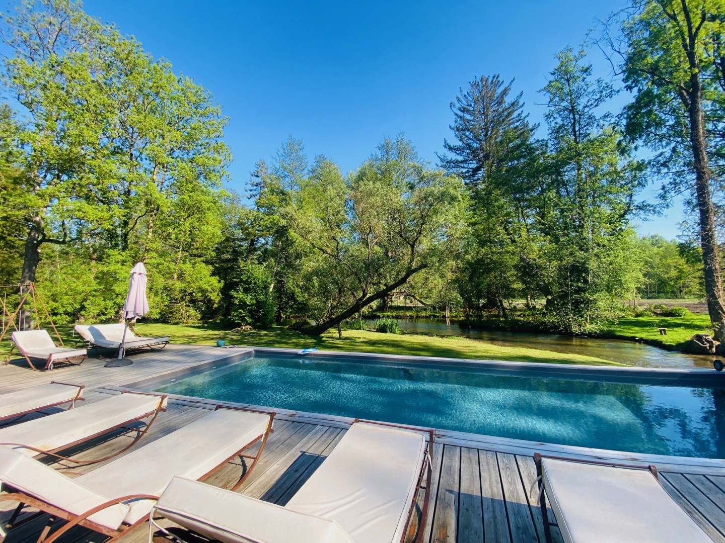 Exposé Sud, cet ancien moulin de 380M2 bénéficie d’une grande terrasse bois surplombant la rivière, avec mobilier campagne chic pour profiter de la piscine et déjeuner en plein air.